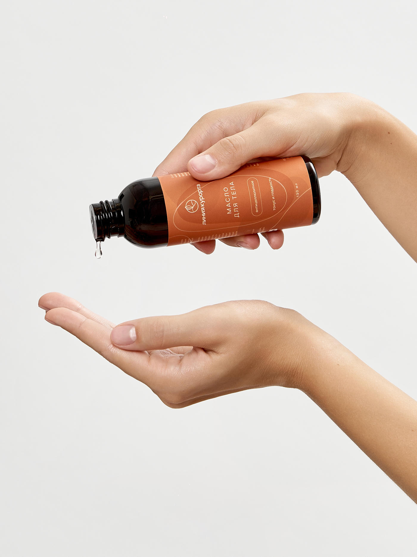 Антицеллюлитное массажное масло сочетает растительные масла и экстракты, направленные на выравнивание рельефа кожи и повышение её гладкости. Персиковое масло и масло виноградной косточки питают, увлажняют и поддерживают упругость кожи, способствуя синтезу коллагена и эластина. Масло лесного ореха и шиповника смягчают кожу и делают её более шелковистой. Комплекс экстрактов имбиря, каштана, ламинарии, фукуса, хвоща и плюща улучшает микроциркуляцию и уменьшает проявления отечности. Экстракт зелёного кофе усиливает лимфодренажный эффект, помогая коже выглядеть более подтянутой и ровной.
